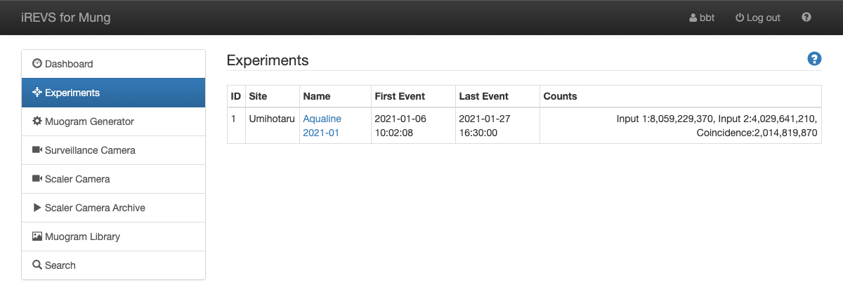 Click each link of experiment to display Experiments details page and you can refer the statistics and daily Muogram.