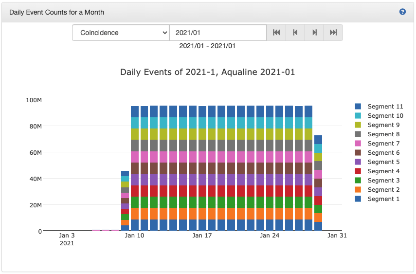 Daily event counts for a month panel displays the number of events in each month's corresponding experiment with a stacked bar graph by segment.