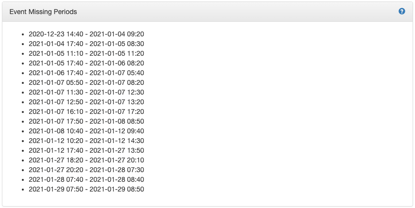 The missing period of the events consist in units of 10 minutes with no events.