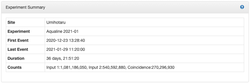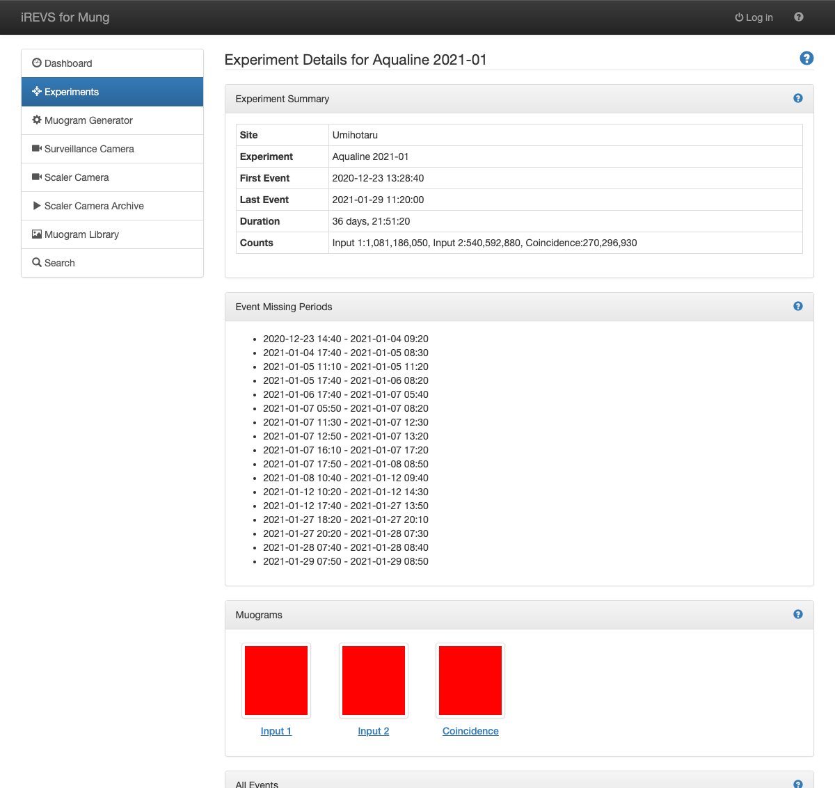 Experiment details show summary information, event missing period, Statistics Muogram, statistics, Daily Muogram of the experiment.