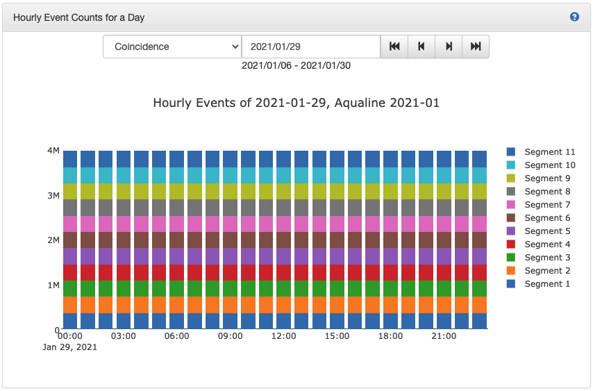 Hourly event counts for a day panel displays the number of events per day for the corresponding experiment with a stacked bar graph by segment.