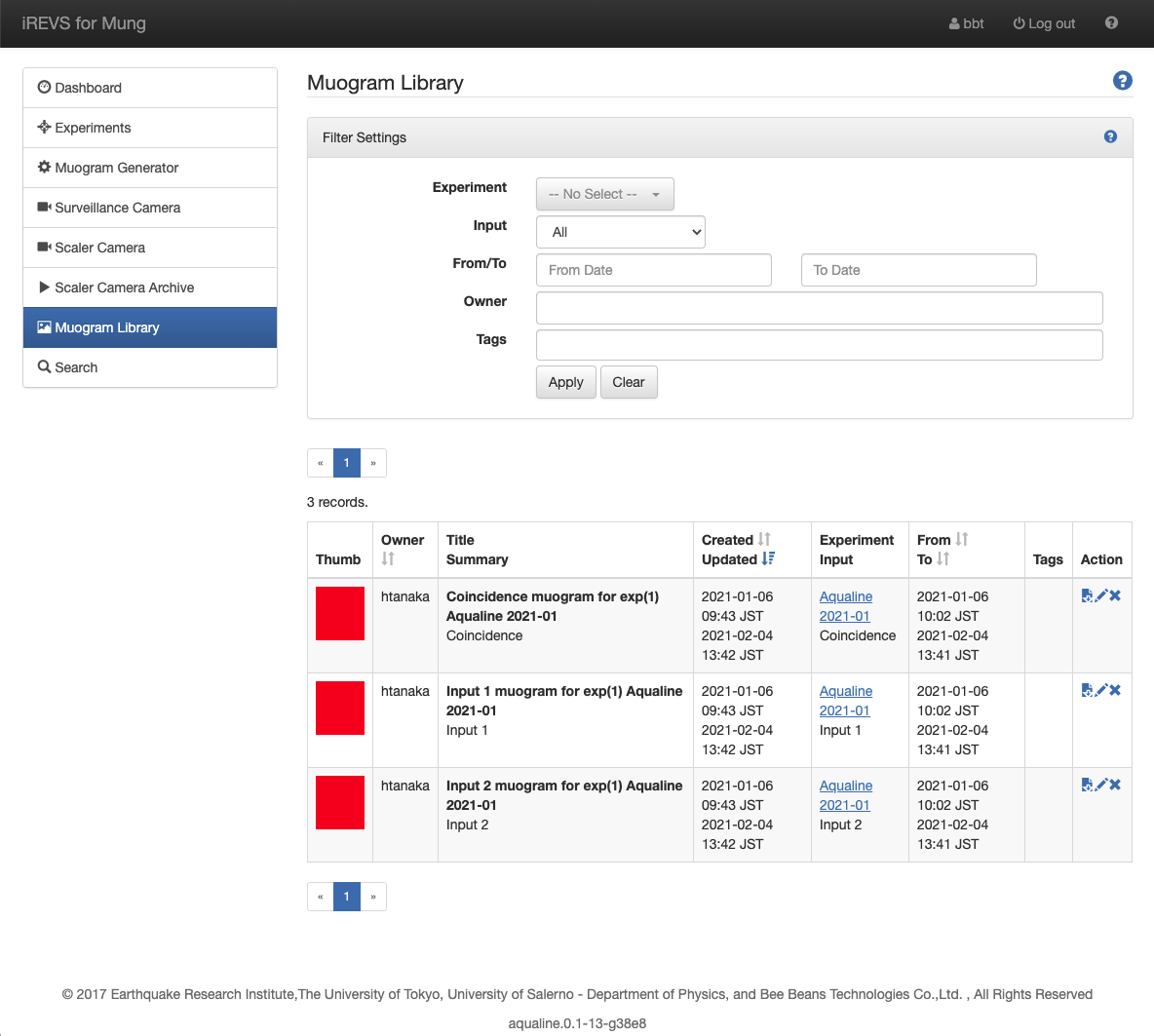 In the Muogram Library, you can display the saved Muograms generated by Muogram Generator and display the total of Muogram of each experiment.